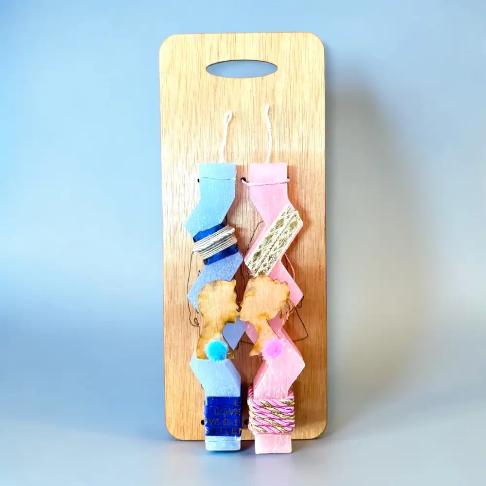Χειροποίητο σετ πασχαλινών λαμπάδων για αγόρι και κορίτσι, διακοσμημένες με ξύλινα διακοσμητικά στοιχεία και απαλές παστέλ αποχρώσεις. Ιδανικό πασχαλινό δώρο για αδέλφια ή δίδυμα βαφτιστήρια.