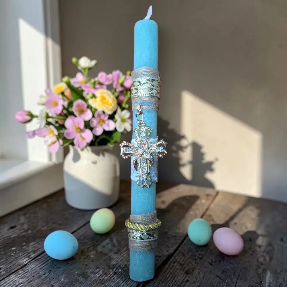 Η χειροποίητη πασχαλινή λαμπάδα με διακοσμητικό κόσμημα σταυρό αποτελεί μια κομψή και ιδιαίτερη επιλογή για το Άγιο Πάσχα.