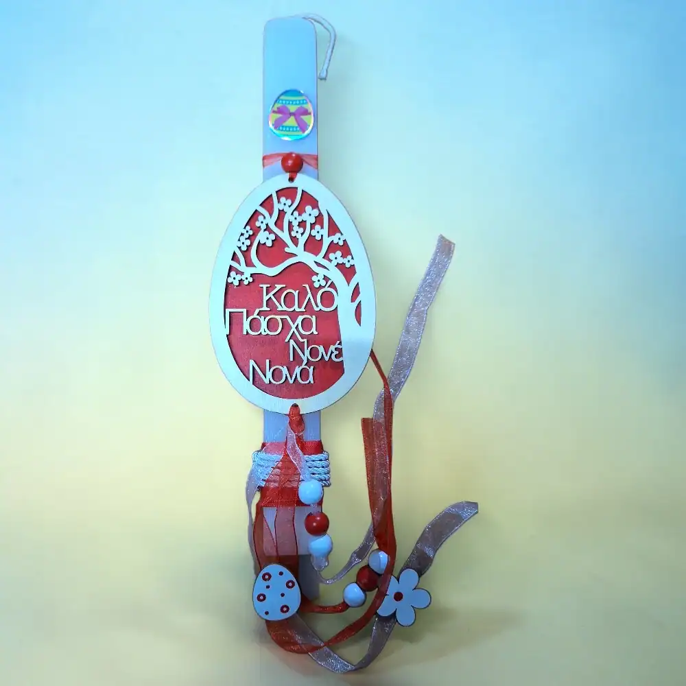 Η λαμπάδα είναι διακοσμημένη με ξύλινο πασχαλινό στοιχείο σε σχήμα αυγού που φέρει το μήνυμα «Καλό Πάσχα Νονέ Νονά», δημιουργώντας ένα τρυφερό και ξεχωριστό δώρο.