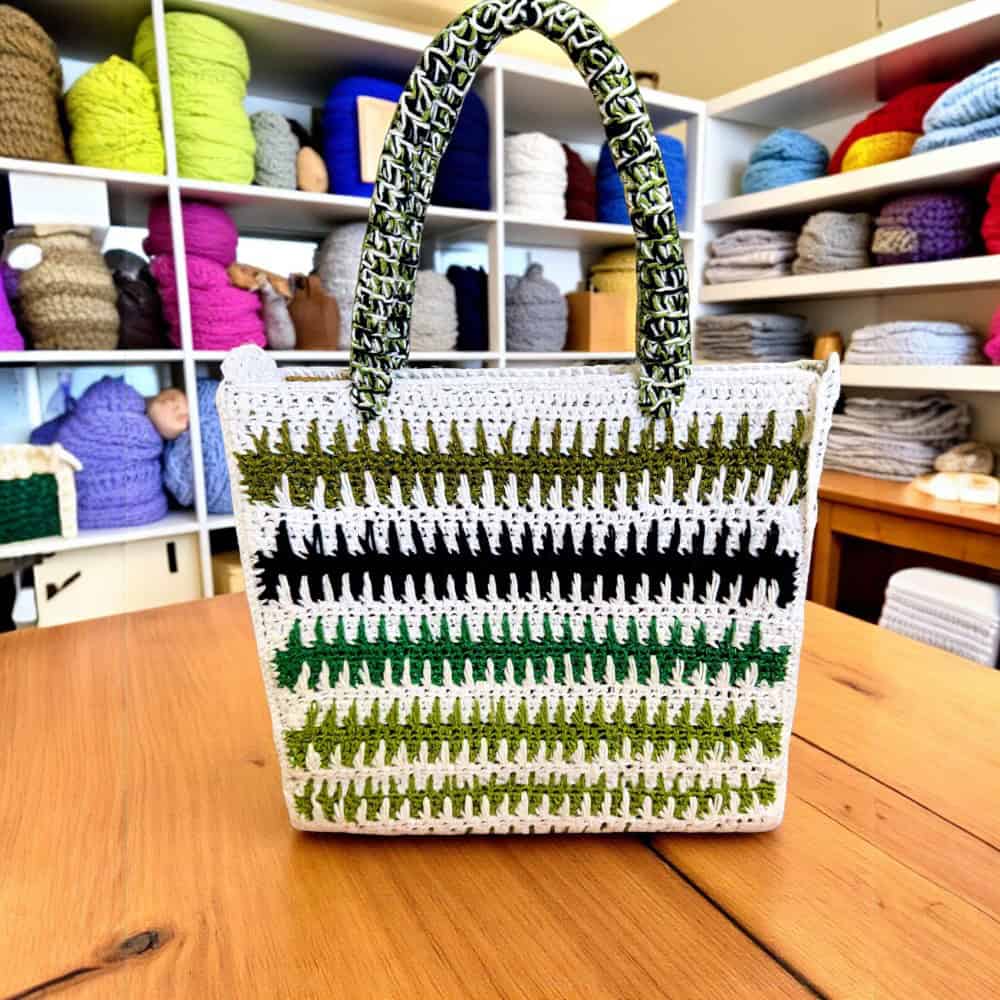 Η Χειροποίητη Πλεκτή Τσάντα με Ριγέ Σχέδιο είναι μια πλεκτή τσάντα ριγέ σε φυσικούς πράσινους και ουδέτερους τόνους, ιδανική για καθημερινή χρήση.