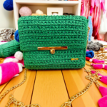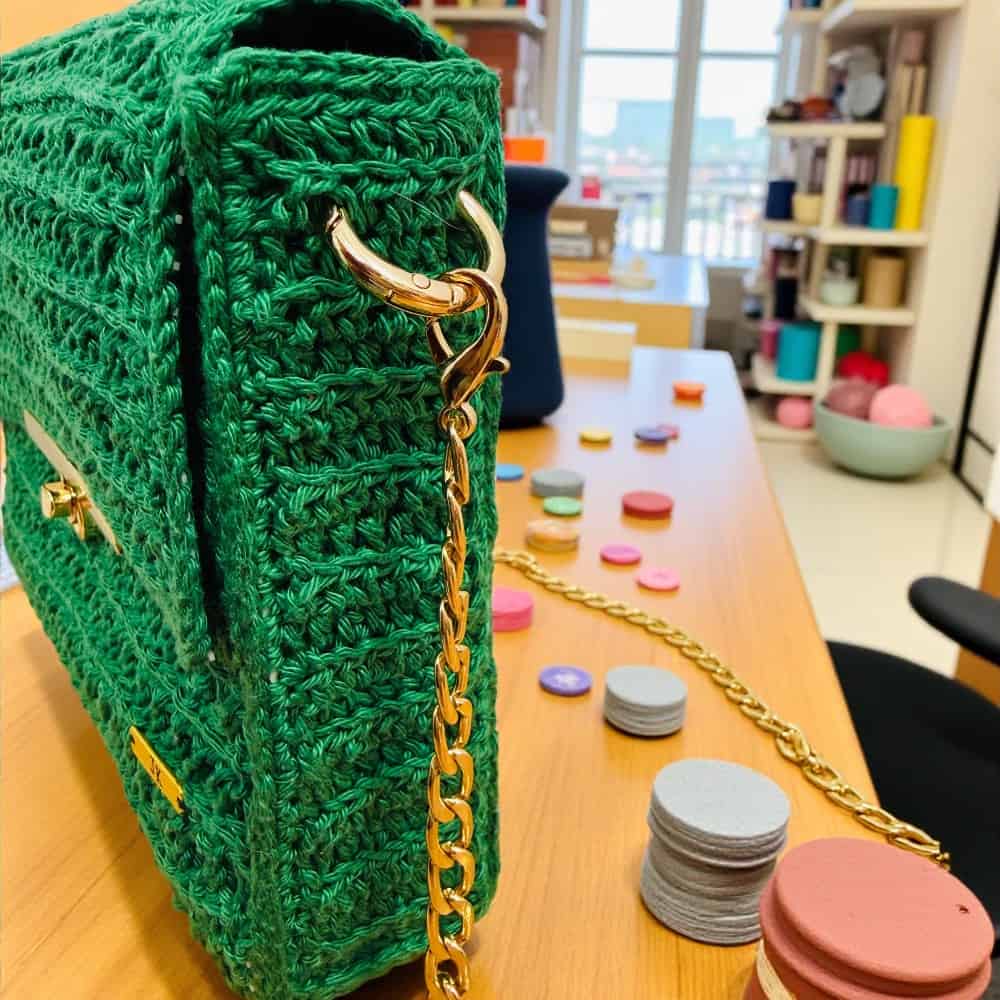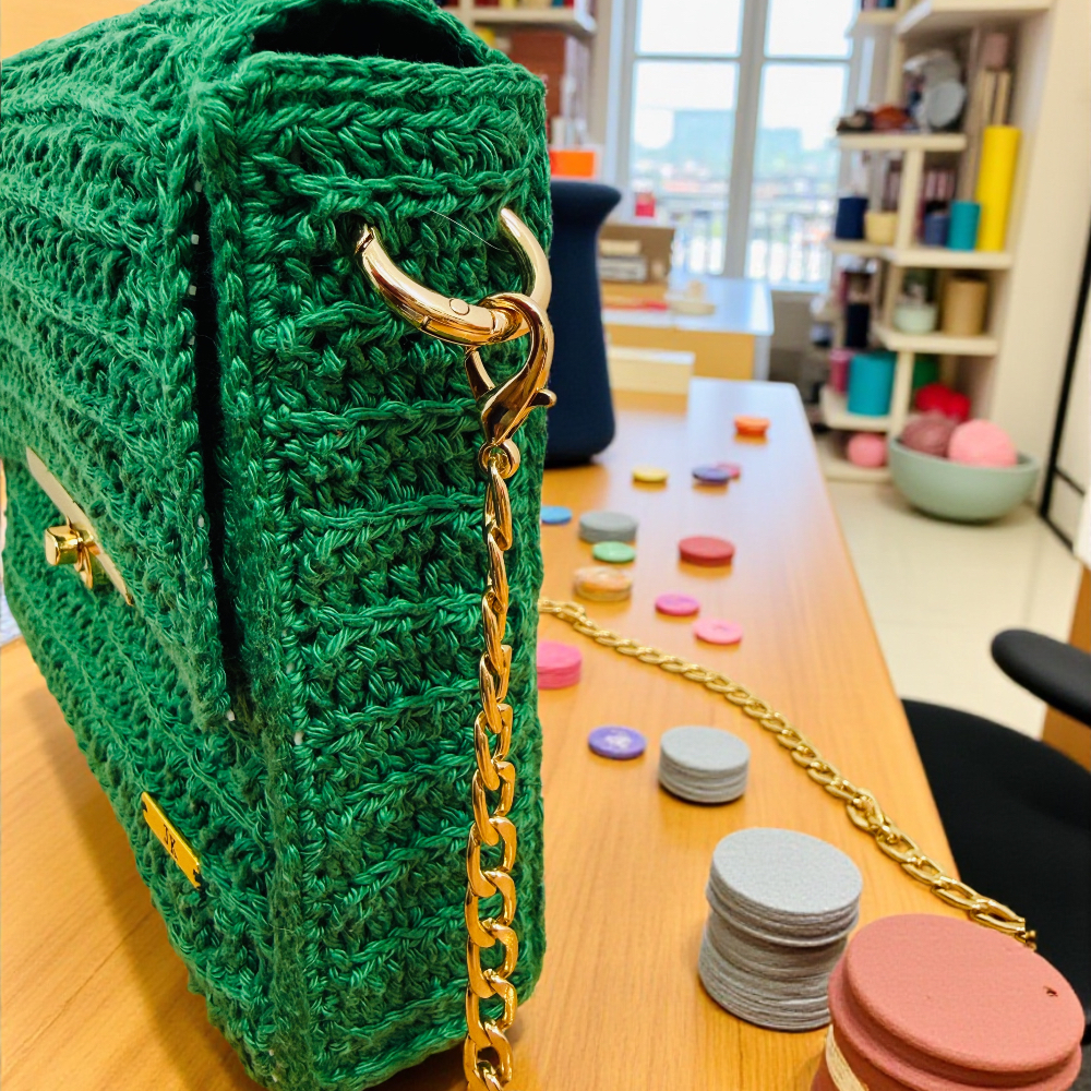 Χειροποίητα πλεγμένη με προσοχή και αγάπη, συνδυάζει ζωντανό πράσινο χρώμα με χρυσές λεπτομέρειες, προσφέροντας μια αίσθηση κομψότητας και φυσικής φρεσκάδας.