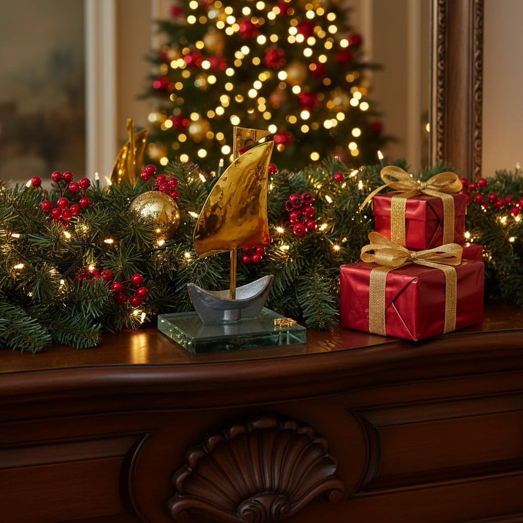 Το παραδοσιακό χρυσό μεταλλικό καραβάκι, σύμβολο της Ελληνικής τύχης και ευημερίας, στέκεται κομψά πάνω σε γυάλινη βάση και φωτίζει τις γιορτές με γοητεία και διακριτική πολυτέλεια. Χειροποίητη κατασκευή με έμφαση στη λεπτομέρεια, ιδανική για το σαλόνι, το τζάκι ή ως δώρο σε αγαπημένα πρόσωπα. Ένα διαχρονικό στολίδι που ενώνει παράδοση και σύγχρονη αισθητική, μεταφέροντας το μήνυμα της νέας χρονιάς με τύχη και αισιοδοξία.
