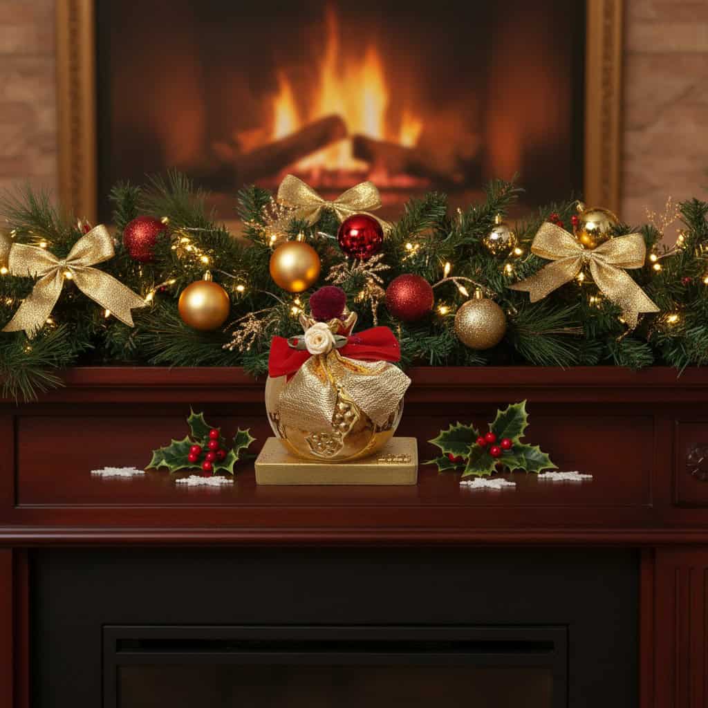 • Στολισμός: Χρυσό ρόδι με φιόγκο & υφασμάτινη διακόσμηση