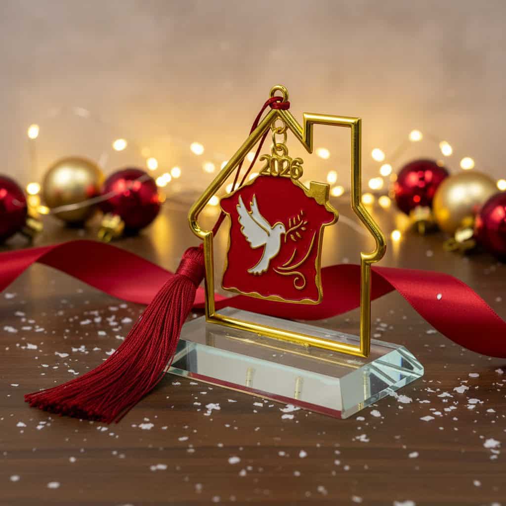 Ένα επιτραπέζιο γούρι κατασκευασμένο με σεβασμό στην παράδοση και σύγχρονη αισθητική. Το λευκό περιστέρι με κλαδί ελιάς, σύμβολο ειρήνης και αναγέννησης, συνδυάζεται με χρυσές λεπτομέρειες και γυάλινη βάση υψηλής ποιότητας. Η κόκκινη φούντα προσθέτει το χαρακτηριστικό χρώμα της καλής τύχης. Ένα ιδανικό δώρο για όσους αγαπούν τη νοσταλγία, τη διακόσμηση και τα νοήματα.