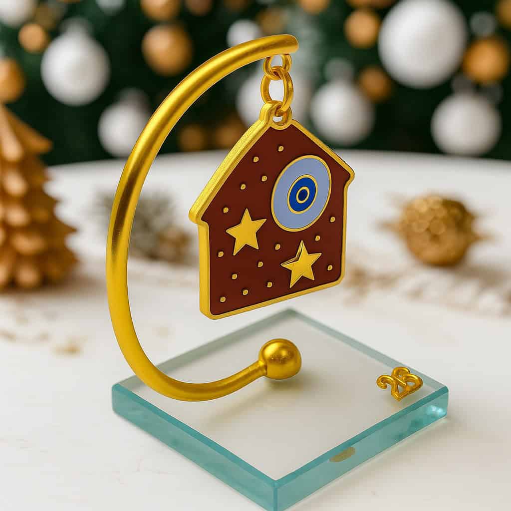 Το στοιχείο κρέμεται από χρυσό τόξο και στηρίζεται σε κομψή γυάλινη βάση, όπου ξεχωρίζει το χρυσό 2026. Η αισθητική του είναι ζεστή, γιορτινή και ταυτόχρονα μοντέρνα, ταιριάζοντας τόσο σε σαλόνι ή γραφείο όσο και σε επαγγελματικούς χώρους. Ένα δώρο που “γράφει” γιατί συνδυάζει ματάκι, σπίτι και αστέρι – τριπλή δόση καλής ενέργειας.