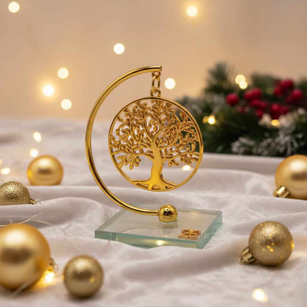 Επιτραπέζιο γούρι Δέντρο Ζωής 2026 με γυάλινη βάση και χρυσό, διάτρητο δέντρο μέσα σε στρογγυλό πλαίσιο. Σύμβολο ευημερίας, σταθερότητας & ανάπτυξης, ιδανικό για δώρο και κομψή διακόσμηση.