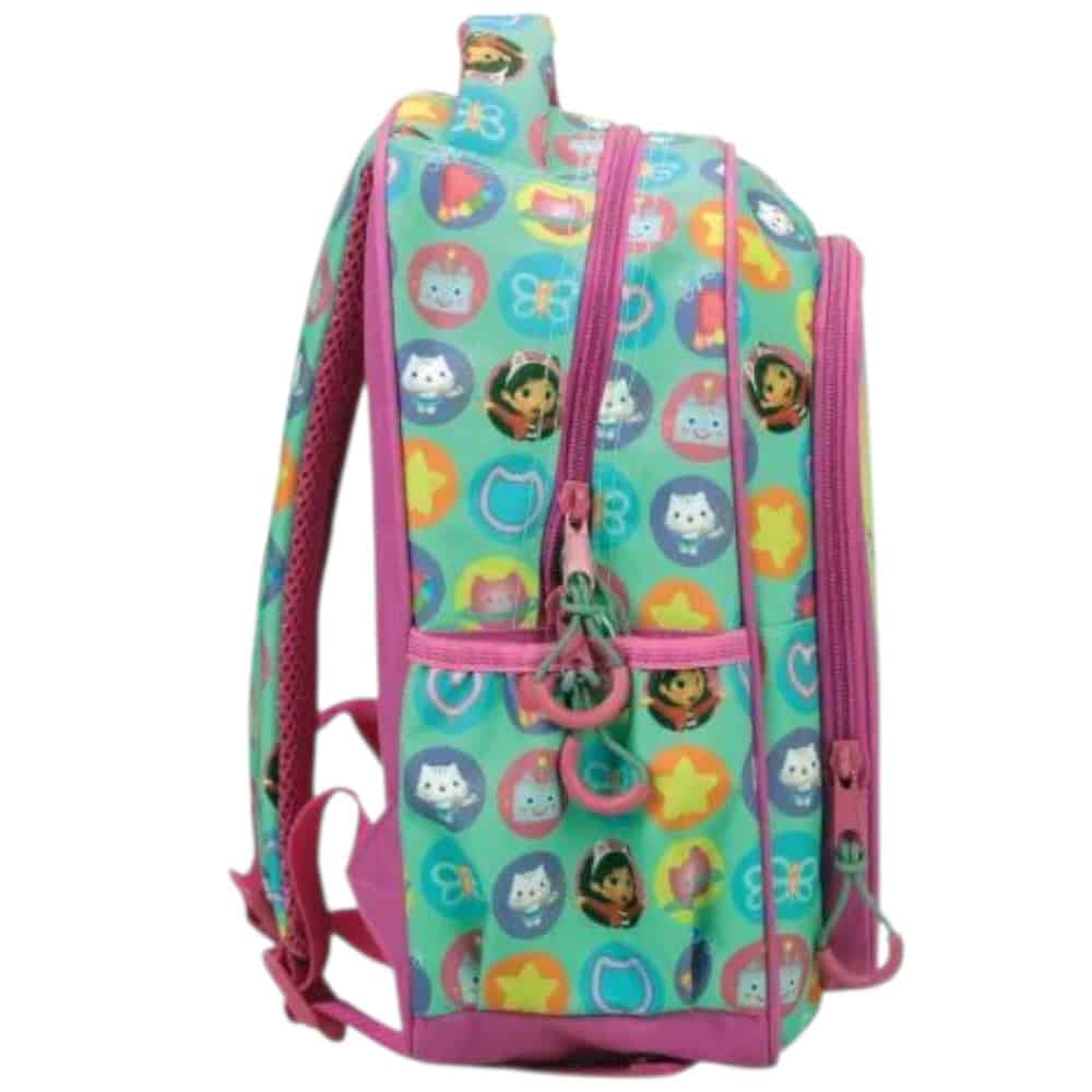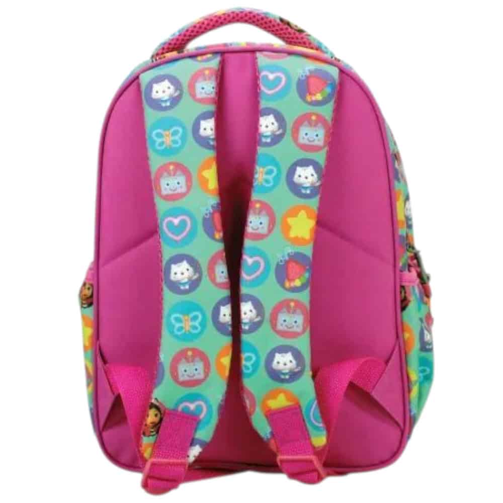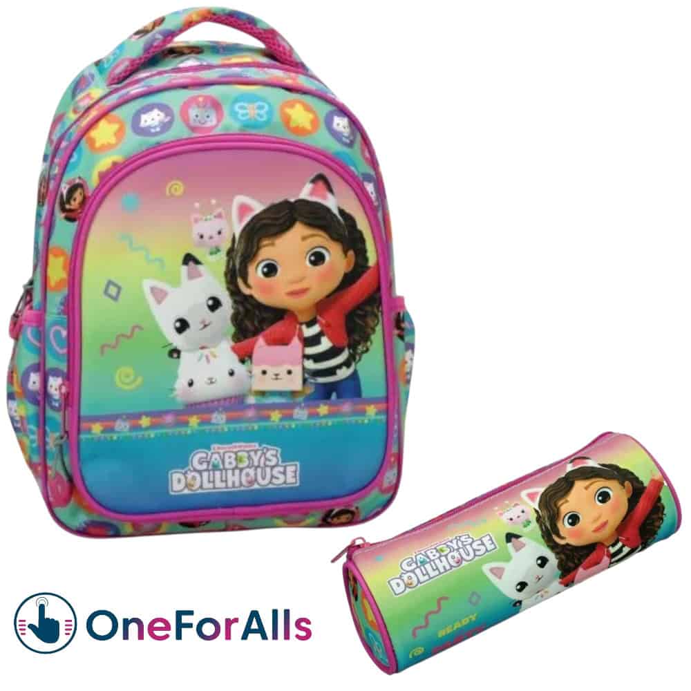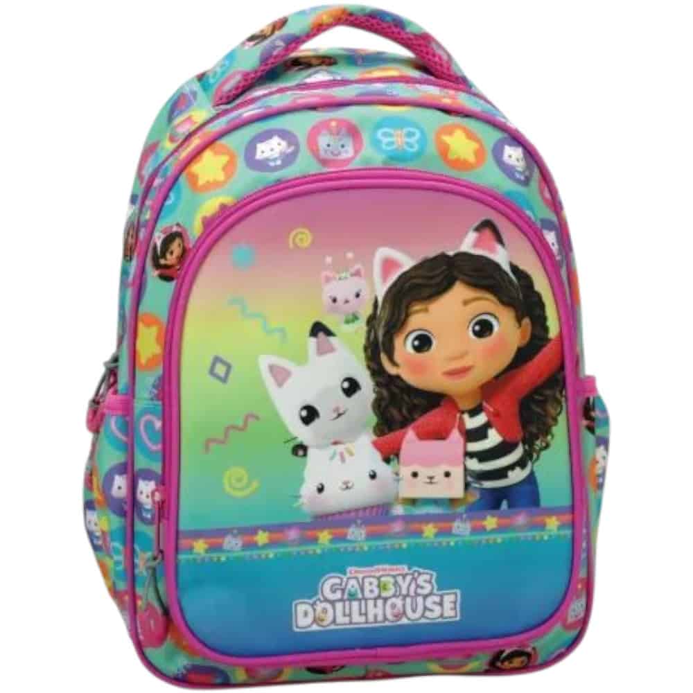 | 🎉 Παρέα με γατο-σπινθήρες! | Το Gabby’s Dollhouse φέρνει το play-room της Γκάμπι κατευθείαν στο νηπιαγωγείο: • Τσάντα πλάτης νηπιαγωγείου με δύο θήκες, μπροστινό pocket & πλαϊνή υποδοχή παγουριού. Rainbow gradient, ροζ piping και cat-αυτάκια σε κάθε γωνία!• Κασετίνα barrel (γεμάτη 30 σχολικά) – μαρκαδόροι, ξυλομπογιές, μολύβια, γόμα, ξύστρα, χάρακας: έτοιμο “meow-art”.Ανατομική πλάτη, ελαφρύ υλικό 600D και φίνα φερμουάρ με γατο-μενταγιόν – για να κυλά η μέρα σαν επεισόδιο Dollhouse! |