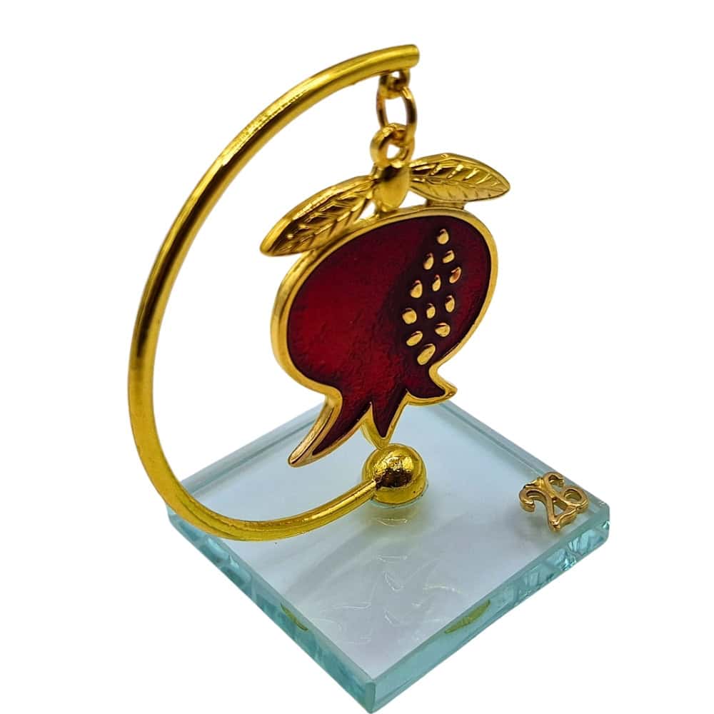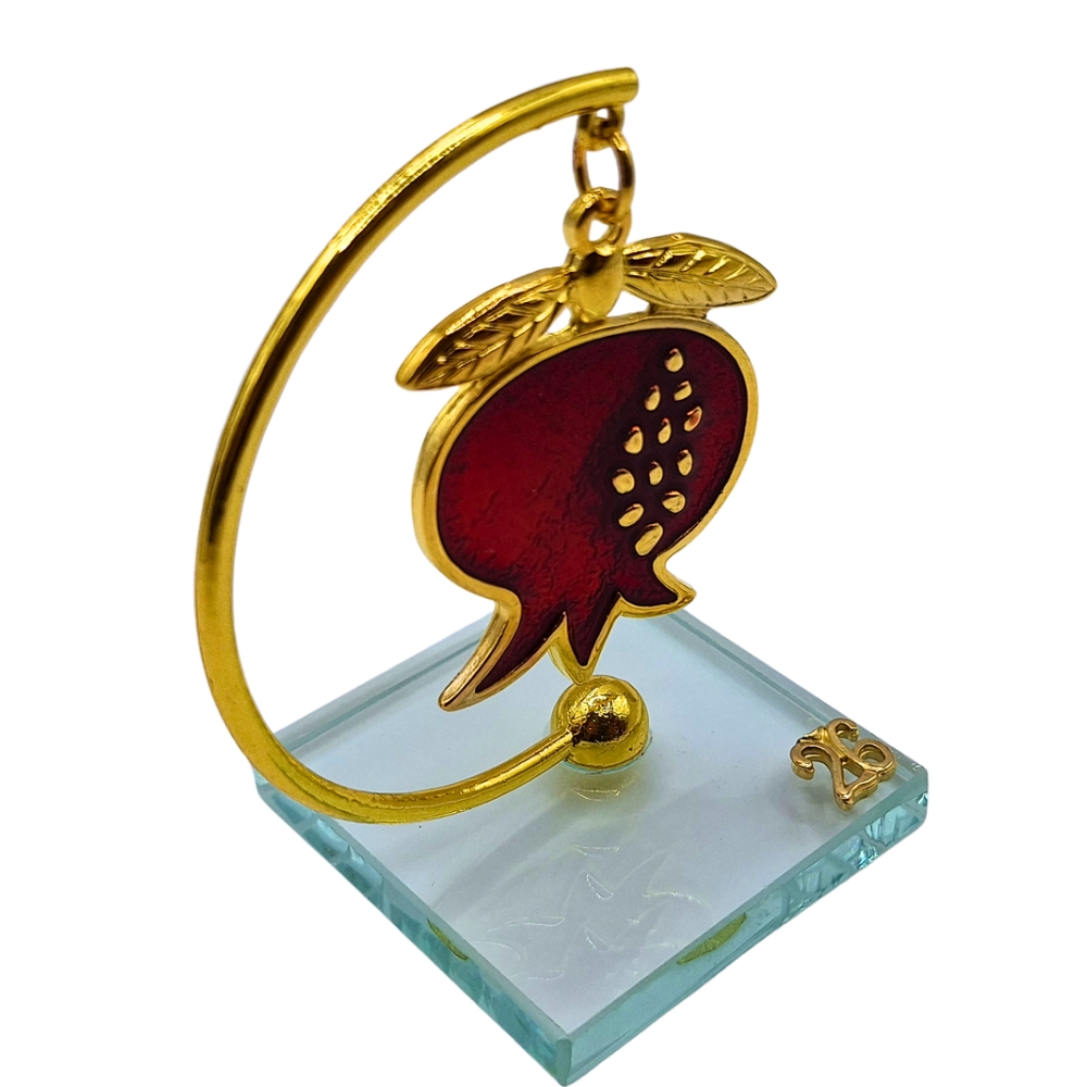 Επιτραπέζιο γούρι Ρόδι 2026 σε βαθύ κόκκινο χρώμα με χρυσό στήριγμα και γυάλινη βάση. Το ρόδι συμβολίζει τύχη, αφθονία & καλοτυχία για τη νέα χρονιά.