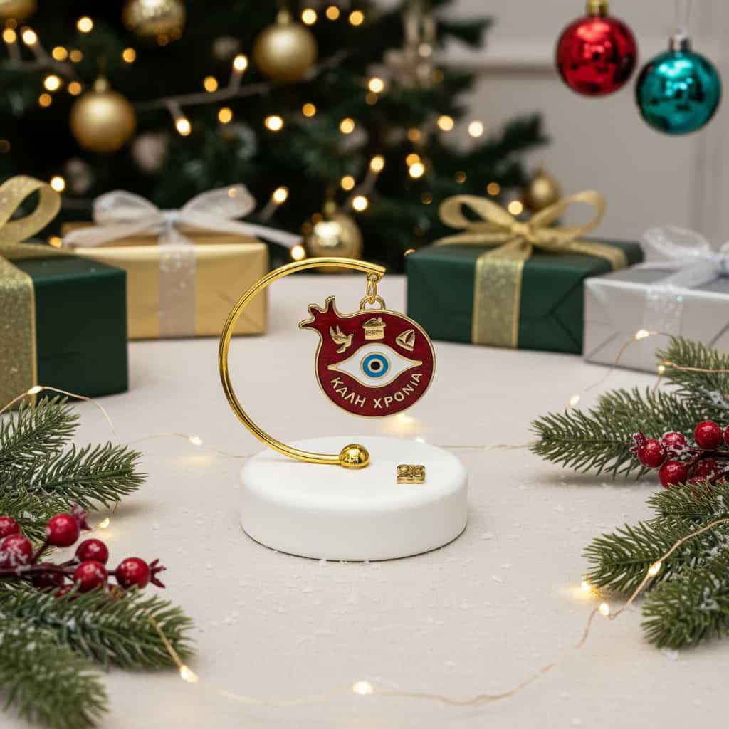 Το ρόδι, αιώνιο σύμβολο αφθονίας και καλοτυχίας, γίνεται εδώ ένα ζεστό, γιορτινό στολίδι που φέρνει στο χώρο την ελληνική παράδοση και την ευχή για ένα φωτεινό νέο έτος.