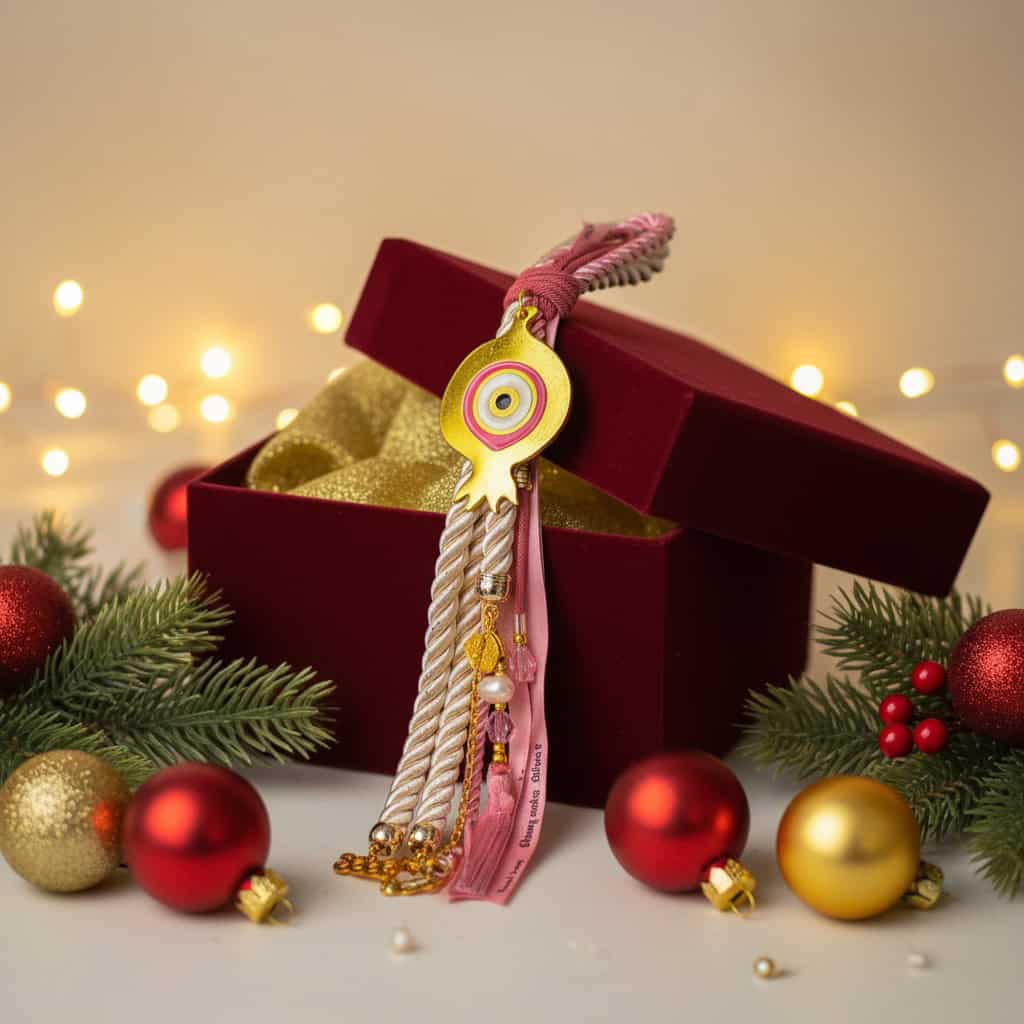 Εντυπωσιακό γούρι 2026 με ρόδι-μάτι, σε πολυτελή κόκκινη βελούδινη συσκευασία.