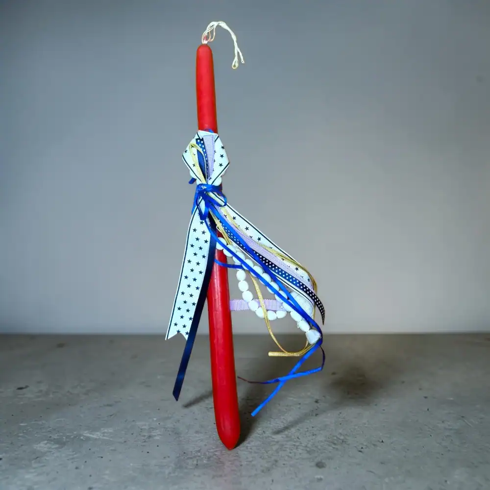 Η πασχαλινή λαμπάδα με κόκκινο κερί και διακοσμητικές κορδέλες αποτελεί μια όμορφη και οικονομική επιλογή για το Πάσχα. Ο στολισμός της περιλαμβάνει κορδέλες σε μπλε και λευκές αποχρώσεις, διακοσμητικές τρέσες και μικρές λεπτομέρειες, που δίνουν μια κομψή πασχαλινή εμφάνιση.