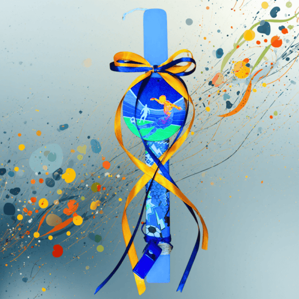Χειροποίητη πασχαλινή λαμπάδα με θέμα μπάσκετ και Jordan, διακοσμημένη με φιγούρα μπασκετμπολίστα και σφυρίχτρα. Μια δυναμική αρωματική λαμπάδα που αποτελεί ιδανικό πασχαλινό δώρο για παιδιά που αγαπούν το μπάσκετ.