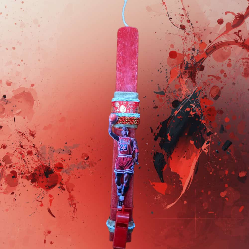 Η χειροποίητη πασχαλινή λαμπάδα μπάσκετ Jordan είναι μια ξεχωριστή επιλογή για παιδιά που αγαπούν τον αθλητισμό και ιδιαίτερα το μπάσκετ. Διακοσμημένη με φιγούρα μπασκετμπολίστα εμπνευσμένη από τον θρυλικό παίκτη Jordan, δημιουργεί μια εντυπωσιακή και αθλητική πασχαλινή λαμπάδα.