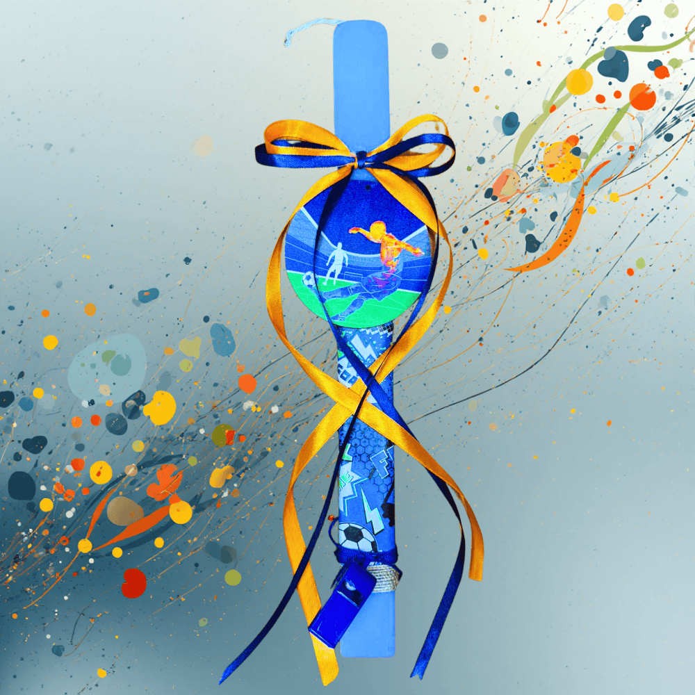 Ο στολισμός της περιλαμβάνει διακοσμητικό στοιχείο με θέμα ποδόσφαιρο, σατέν κορδέλες σε μπλε και χρυσές αποχρώσεις καθώς και μικρή σφυρίχτρα, που δίνει έναν παιχνιδιάρικο και αθλητικό χαρακτήρα στη λαμπάδα.