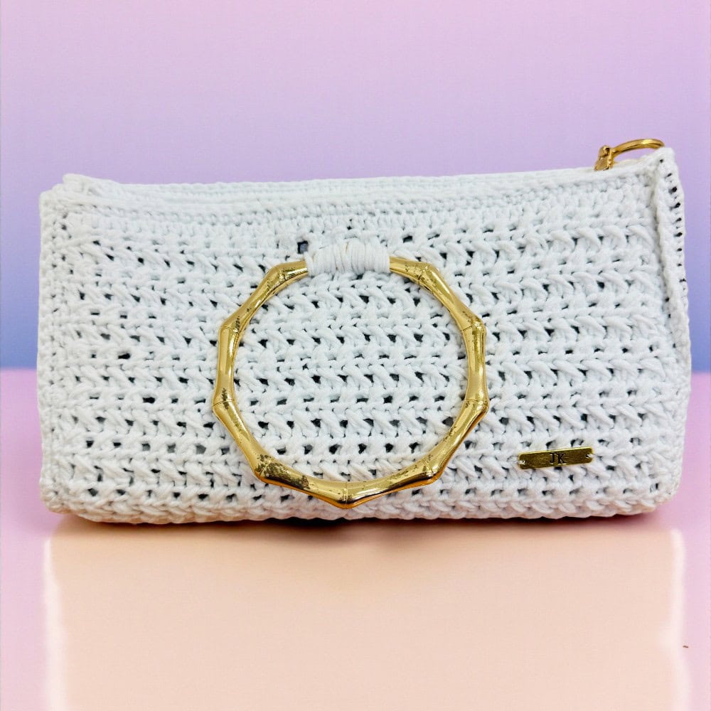 Χειροποίητη από ποιοτικό λευκό πλεκτό νήμα και διακοσμημένη με έναν εντυπωσιακό χρυσό κρίκο τύπου bamboo, αποπνέει πολυτέλεια και φινέτσα σε κάθε λεπτομέρεια.