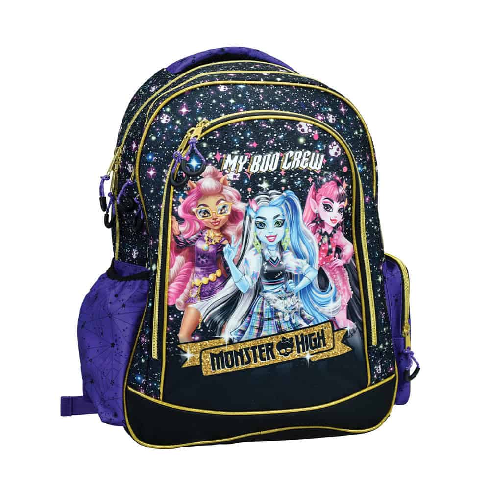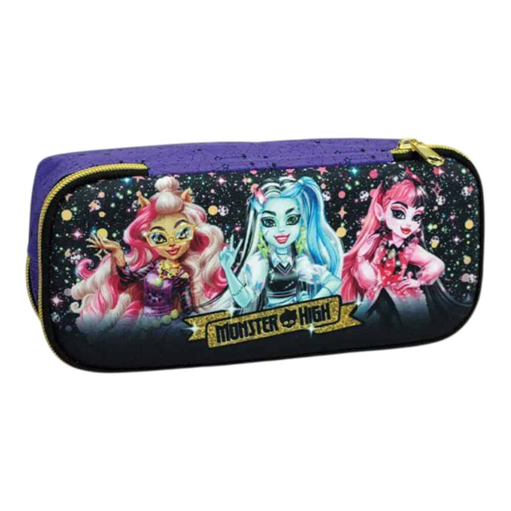 | ✨ Λάμψε σαν super-nova στο προαύλιο! | Το Σχολικό Σετ Δημοτικού Monster High  ενώνει τη Draculaura, τη Frankie, τη Clawdeen και τη Lagoona σε ένα complete 4-in-1 kit: • Τσάντα πλάτης Α4 με δύο βαθιές θήκες, μπροστινό pocket και λαμπερά χρυσά φερμουάρ.• Οβάλ κασετίνα που φυλά μαρκαδόρους, μολύβια & κόμικ μυστικά 🖍️• Ισοθερμικό lunch bag δύο επιπέδων – επάνω σνακ, κάτω παγουρίνο⏤τα πάντα δροσερά ή ζεστά.• Μπλοκ ζωγραφικής Α4 (40 φύλλα) + σελίδα αυτοκόλλητων για να σχεδιάζεις τα δικά σου monster-outfits. Ανατομική πλάτη, υλικό 600D που σκουπίζεται εύκολα, και γαλαξιακό glitter print κάνουν κάθε μάθημα… τρομακτικά διασκεδαστικό! |
