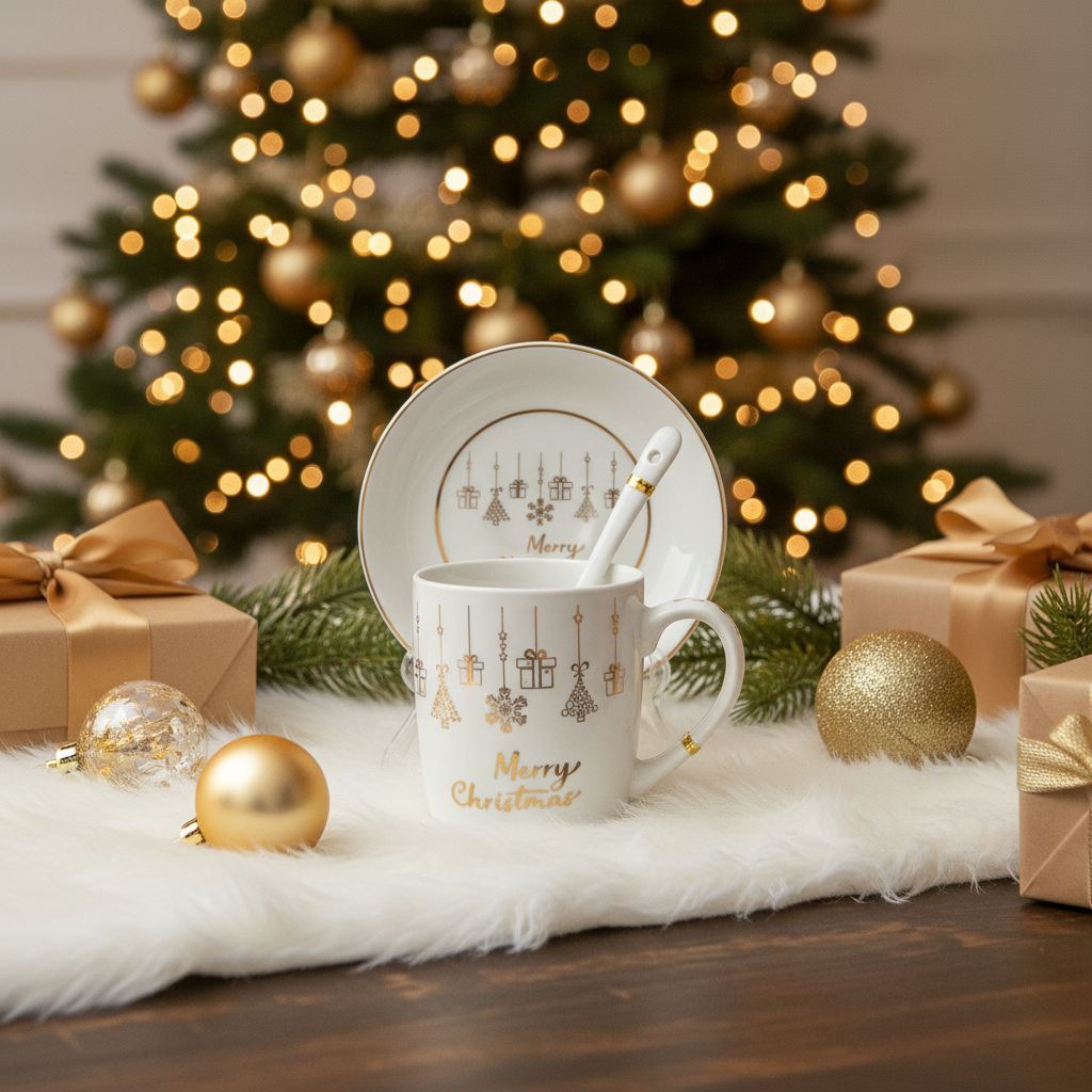 Το Σετ Χριστουγεννιάτικη Κούπα Merry Christmas συνδυάζει λευκή αισθητική με χρυσά γιορτινά μοτίβα και πλαισιώνεται από κουτάλι και πιατάκι, προσφέροντας μια ολοκληρωμένη εμπειρία ροφήματος.