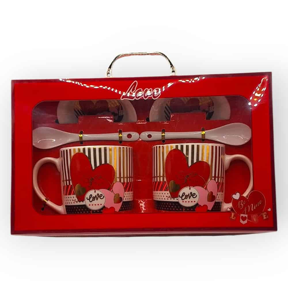 Δώρο “για δύο” με στιλ: σετ Love με 2 κούπες, 2 πιατάκια και 2 κουταλάκια, σε έτοιμη συσκευασία δώρου με χερούλι. Για καφέδες που ξεκινούν τη μέρα… σωστά.